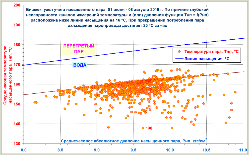 Так выглядит статистическая зависимость Тнп = f(Рнп) за последние 921 час (с 1 июля по 8 августа). На то похоже, что в потреблении пара случаются частые перерывы, в течение которых паро-конденсатная смесь быстро остывает (вплоть до 138 °С, что на 39 °С ниже линии насыщения). Возможно, что при этом степень сухости пара приближается к нулю, и измерять расходомеру уже нечего (весь или почти весь пар превратился в конденсат). В результате имеем значительное занижение учёта массы пара и тепловой энергии, т.к. СПТ961 учитывает только паровую фазу и "не видит" конденсата. С целью предотвращения расточительного расходования пара местным технологам имеет смысл подумать над тем, чтобы исключить многочисленные перерывы в подаче пара. -