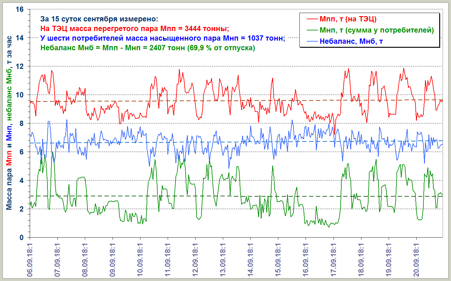 Проблема измерений насыщенного пара существовала всегда. Но в постсоветское время эта проблема стала ещё острее - диаметры и протяженность паропроводов остались прежними, а потребление пара многократно сократилось. Да и состояние изоляции вряд ли улучшилось. И небалансы в учёте отпуска и потребления пара стали нарастать, как снежный ком. У нас есть паропровод Ду500 протяжённостью более 5 км, к которому в старые времена было подключено более 20 потребителей со средним потреблением около 40 т/ч. Расходы пара были достаточны для того, чтобы к потребителям доходил перегретый пар, который успешно измерялся (на ТЭЦ и у всех потребителей были установлены качественные РППД). И небалансы зимой и летом были близки к нулю. Сегодня к этому паропроводу подключены только 6 потребителей со средним потреблением около 9 - 10 т/ч. У всех потребителей круглосуточно - сильно влажный пар, хотя на ТЭЦ пар по-прежнему перегретый на 20 - 40 °С. Вот какая картина с небалансами наблюдалась на этом паропроводе в сентябре прошлого года: Картина получилась, прямо скажем, "сильно не очень": ТЭЦ выдала в паропровод 3444 тонны перегретого пара, а потребители намерили только 1037 тонн влажного пара. Исчезло в никуда в виде конденсата 2407 тонн, которые в начале паропровода были перегретым паром. Кому следует продать 70 % исчезнувшего пара и тепла - никто не знает. Проблему надо решать на законодательном уровне - чем раньше, тем лучше. Но у наших нормдоков руки до её решения пока не дошли... Дойдут ли? -