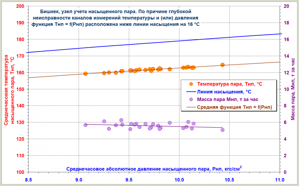 В этом узле учёта пара есть серьёзная проблема с измерениями температуры и (или) давления. Для построения этих функций из архива были отобраны 25 часов, в течение которых потребление пара было наибольшим (5 - 6 т за час). Видно, что статистическая функция Тнп = f(Рнп) параллельна линии насыщения, что указывает на наличие в трубе влажного насыщенного пара. Но по причине серьёзной неисправности канала измерения температуры и (или) давления эта функция глубоко погрузилась в некипящую воду в то время, когда она должна быть наложена на линию насыщения с возможным отклонением в пределах погрешности измерений Тнп и Рнп. Можно ожидать, что в таких условиях СПТ961 не сможет правильно рассчитать массу и энергию пара. Нужно приводить в порядок каналы измерений Тнп и Рнп. -