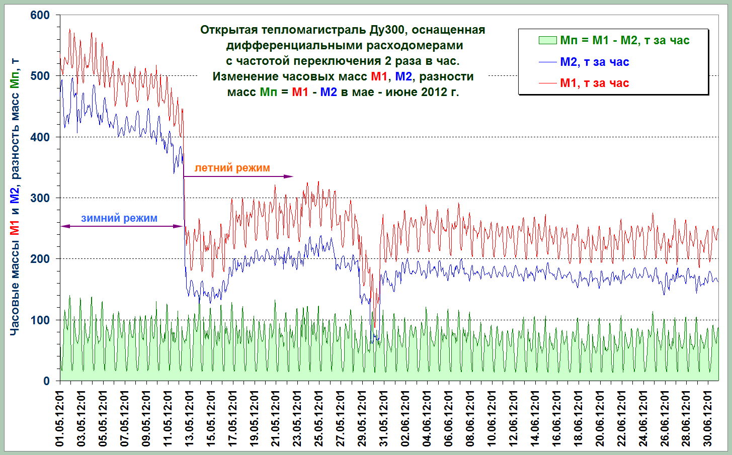 К сожалению, отечественные закрытые системы теплоснабжения на самом деле являются лишь "немножко закрытыми" - в сетях и у потребителей имеются утечки, нередки случаи легкого подворовывания воды из системы. Поэтому на источник теплоносителя всегда возвращается меньше, чем с него уходит. Т.е. технологически всегда выполняется условие М2<М1. Вот для измерения этой утечки Мут = М1-М2 (для открытых систем Мут + Мгвс = М1-М2) в нашей стране повсеместно пытаются измерять разность расходов (разность масс) dM12 = M1-M2. Но, как правило, фактическая погрешность таких измерений настолько велика (десятки, сотни и тысячи процентов), что говорить о достоверном учете не приходится. Обратите внимание на картинку. В крупном городе есть крупная котельная с закрытой магистралью Ду800. Магистраль хоть и закрытая, но слегка дырявая - расходомер подпитки Мп, установленный в подпиточном трубопроводе, ежечасно фиксирует подпитку примерно 20 т/ч. В то же время эта подпитка Мп повторно измеряется как разность масс на тепломагистрали dM12 = M1-M2. Видим, что из-за положительно рассогласования погрешностей расходомеров М1 и М2 завышение учета подпитки на магистрали - в 4,6 раза (на 360%) по отношению к Мп. Столь низкая точность измерений разности масс, особенно в закрытых системах теплоснабжения, является неиссякаемым источником конфликтов и судов между продавцом (ТЭЦ или котельной) и покупателем (Теплосетями). Но, если бы сюда поставить ДИСы (на магистраль - F15-C, на подпитку - F17-АКС), то причина бесконечных разборок - низкая точность измерения разности масс М1-М2 - была бы полностью ликвидирована.