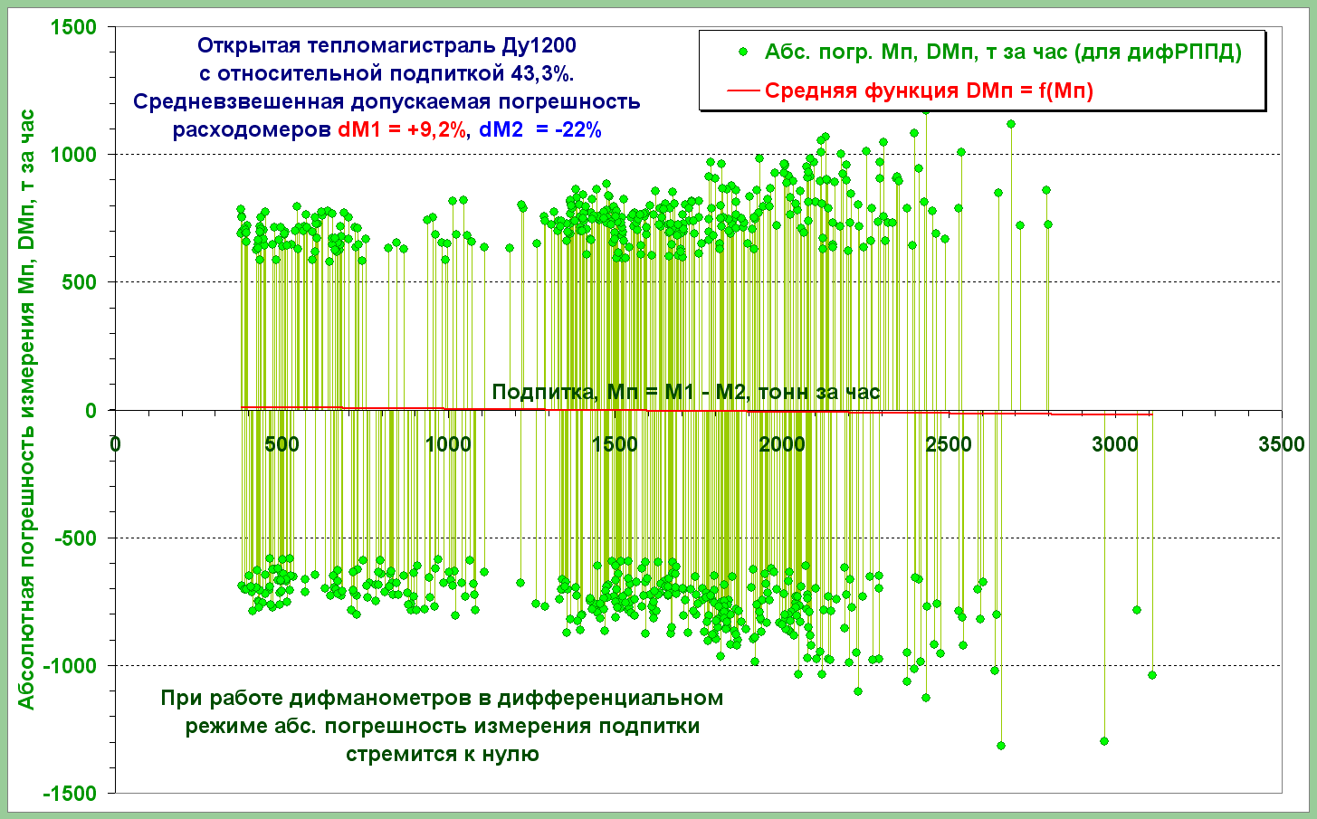 Из графика видно, что характер изменения абс. погрешности измерения подпитки при работе дифРППД на очень малых перепадах изменился. Во-первых, в несколько раз возросла погрешность измерения Мп в четных и нечетных часах. Во-вторых, проявилась нелинейность каждого плеча функции DМп = f(Мп). Однако при этом главное свойство дифРППД сохранилось: средняя тенденция функции DМп = f(Мп) весьма близко расположена к нулевой линии. Т.е. имея весьма значительные погрешности в каналах измерения масс М1 и М2, погрешность измерения подпитки Мп = М1-М2 по-прежнему близка к нулю и составляет всего 0,1%. При отключении дифрежима измерений перепадов погрешность Мп составит уже 50%, или в 500 раз больше, чем в случае работы дифманометров в дифференциальном режиме.