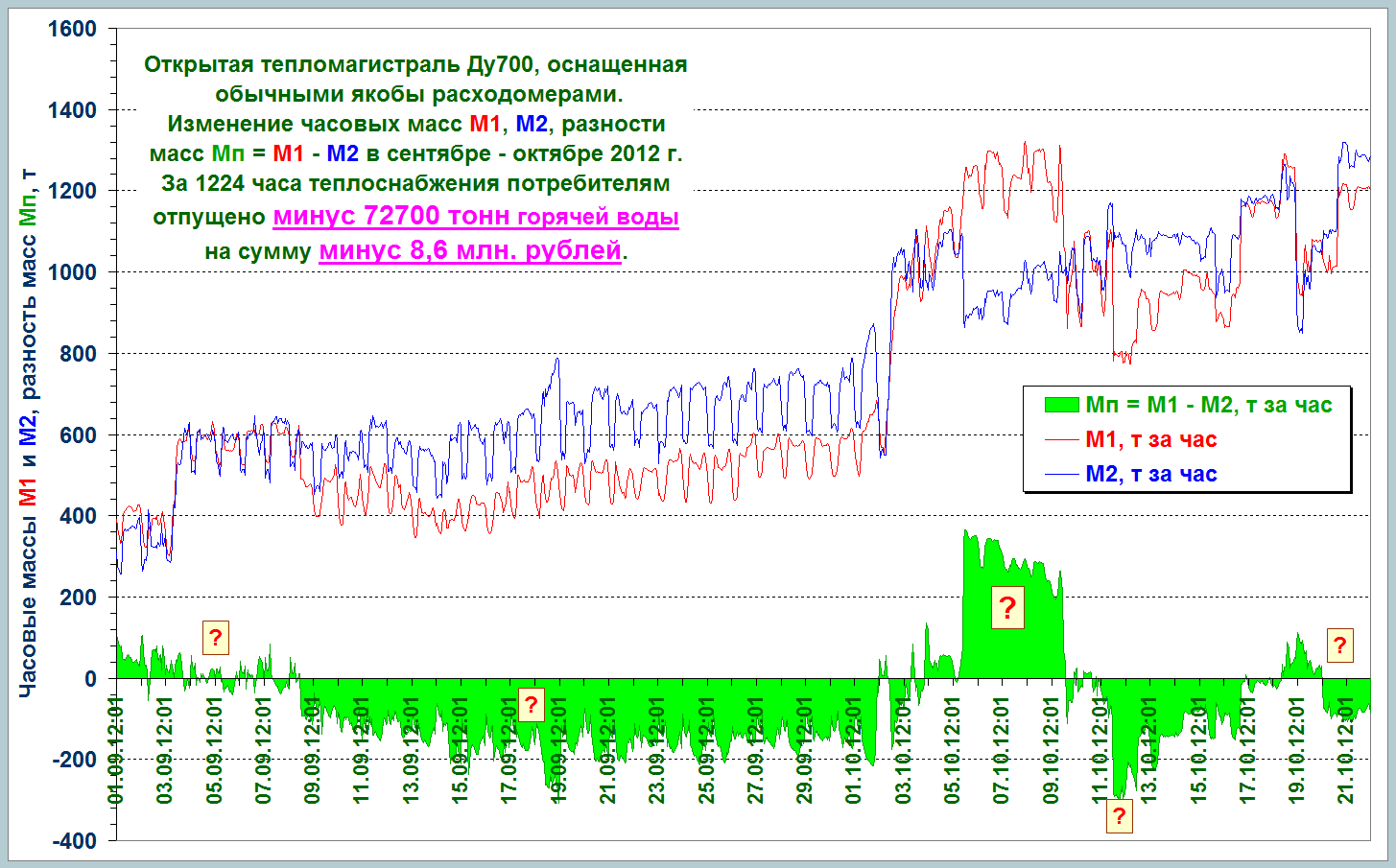 Марсель Хасанович, ну зачем же Вы так неаккуратно с метрологией-то? Я ж уже сколько раз разъяснял про эти несчастные "0,0003%"... И что? Вы упорно продолжаете называть Маню Таней? Или Вы это специально - чтобы меня, така сказать, "слегка раззадорить"? Стало быть, разъясняю в тридесятый раз. И уж точно в последний. Потому что количество упорно не желает переходить в качество. Итак: 0,0003% - ЭТО ЕСТЬ РАСХОЖДЕНИЕ ОТНОСИТЕЛЬНЫХ ВОДОРАЗБОРОВ, ИЗМЕРЕННЫХ В ОТКРЫТОЙ СИСТЕМЕ ДВУМЯ ПАРАМИ дифРППД. И ничего мы не сводим в 0,0003%. Твёрдо и решительно повторяю: решительно ничего! На самом деле мы ИЗМЕРЯЕМ подпитку магистрали двумя совершенно независимыми парами расходомеров в двух совершенно независимых узлах учета. В одном узле учета работает пара (т.е. 2 шт.) токовых ДМов (4 - 20 мА). В другом УУ работает пара цифровых ДМов. В каждый момент времени каждый из ДМов тихо и скромно измеряет свой перепад, который вычислители превращают в расход В СТРОЖАЙШЕМ СООТВЕТСТВИИ С ГОСТ 8.586-2005. А высочайшая (немыслимо высокая!) - до 0,0003% - сходимость двух измеренных относительных водоразборов стала возможной только благодаря сверхточному дифференциальному методу измерений, реализованному в этих двух узлах учета. Но, если мы отключим дифрежим измерений, то мгновенно получим бред и чушь собачью, а не достоверный учет подпитки и тепла с этой подпиткой. Хотите взглянуть, в какую метрологическую гадость превращаются дифизмерения при переводе их в режим "обычных" измерений?