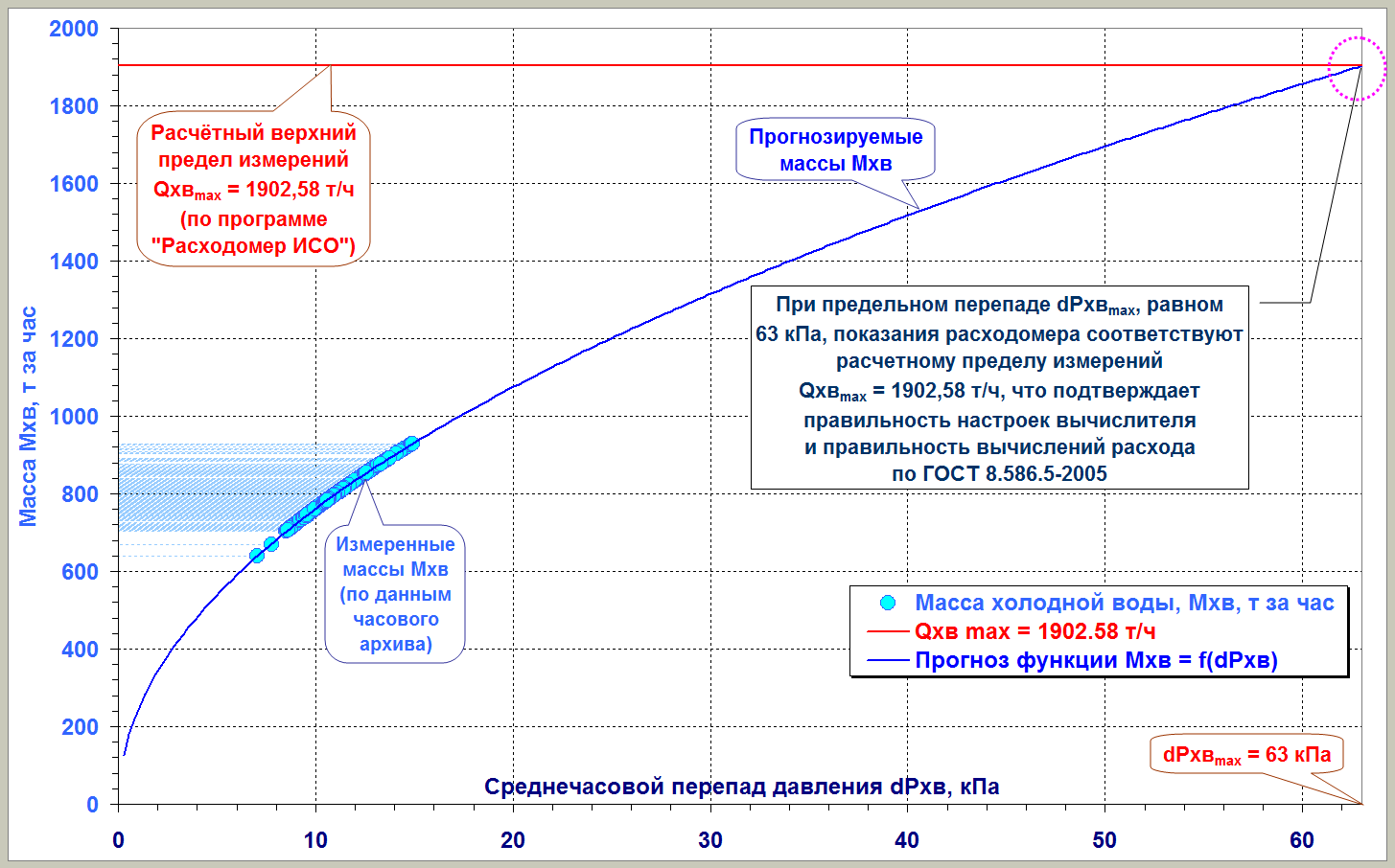 Это кому как. Для нас ГОСТ указ. Убедительным доказательством этому утверждению служит хотя бы эта картинка: Здесь показаны статистическая и прогнозируемая зависимости часовых масс холодной воды (Мхв) от среднечасовых перепадов (dPхв). Статистика (синие кружочки) взята из часового архива одного из вычислителей, установленных в данном УУХВ на базе АКС ( у нас в узлах учёта ведут параллельный счёт два вычислителя). Прогнозируемая функция Мхв = f(dPхв) построена по статистическим данным. Видим, что при расчётном (предельном) перепаде, равном 63 кПа, прогноз в точности совпадает с расчётным Qхвmax = 1902,58 т/ч. Расчёт расходомера выполнен по программе "Расходомер ИСО", которая, в свою очередь, разработана по ГОСТ 8.586. Коль скоро результаты расчётов по "Р-р ИСО" и часовые массы из узла учёта идеально совпадают, то сомнений нет: ГОСТ наши вычислители блюдут в полной мере. Если у кого-то на этот счёт имеются сомнения, то хотелось бы увидеть какие-нибудь доказательства обратному утверждению.