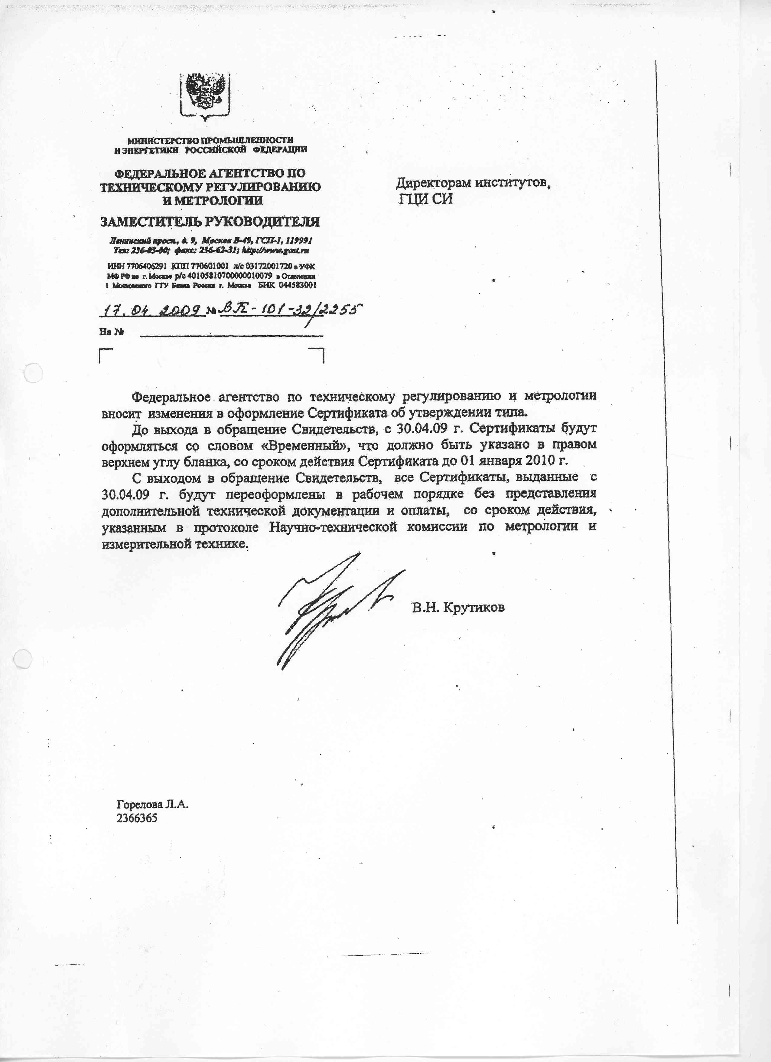 письмо В.Н. Крутикова № ВК-101-32/2255 от 17.04.2009 г. что касаемо вопроса Сертификат или свидетельство... -
