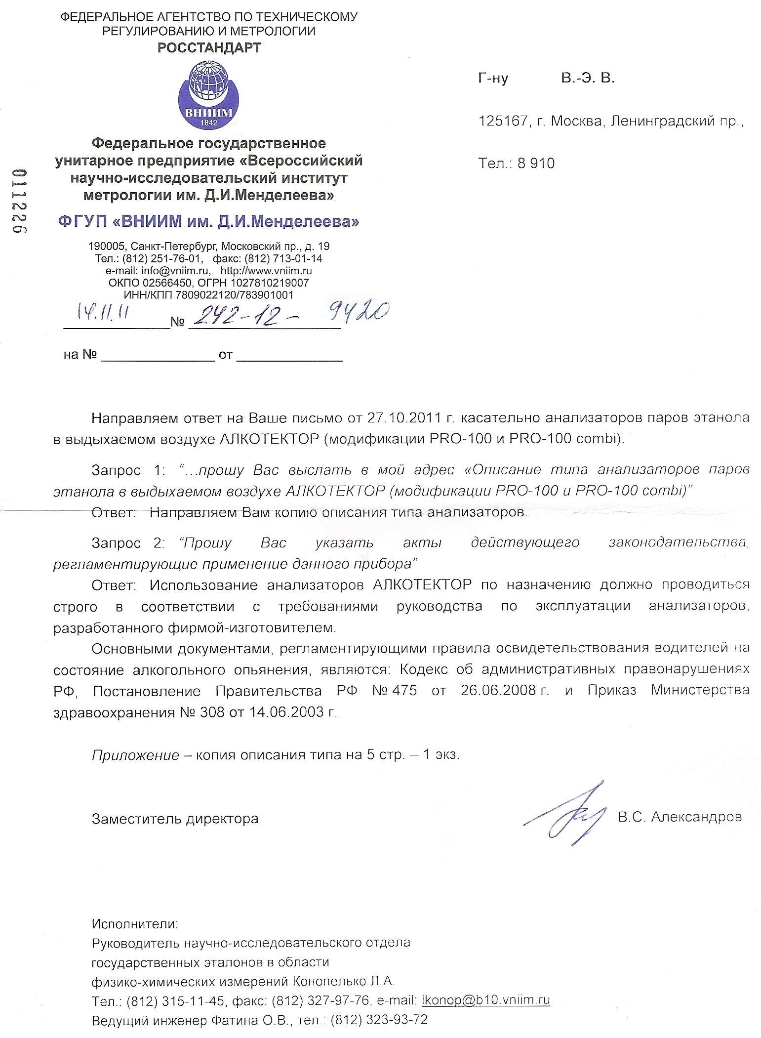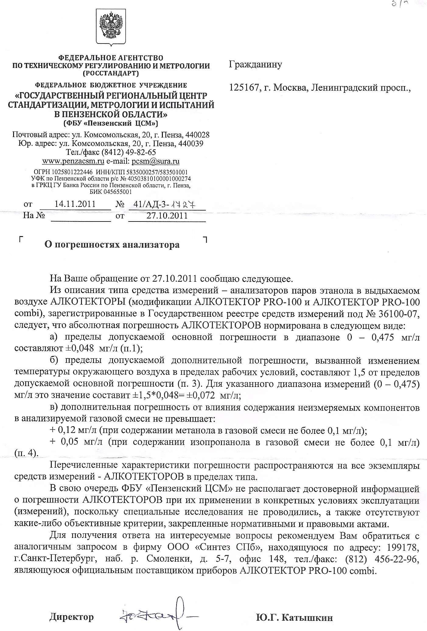 1. Запрос был в виде письма электронной почты? Следовательно, не подписан? Если так, то ответа не дождётесь! Ответ может быть получен на подписанное письмо, в крайнем случае, на факс или скан-копию подписанного письма. В суде тоже ответ нужен на бумаге, подписанный. 2. Если Вы из Москвы, то почему в Пензенский? Есть ещё 85 ЦСМ! К нам, конечно, приходят запросы из Москвы, Калининграда, Хабаровска, но суд, наверняка спросит: почему именно в Пензенский? Что Вы им на это ответите?! Тем более, что в Москве есть и Ростест, и ВНИИМС, и Росстандарт. На любое подписанное обращение мы, конечно, не можем не дать ответ, но всё это для суда будет выглядеть сомнительным. Александр Александрович! 1. Запрос был письмом с уведомлением о вручении на имя директора (приняла его Кезина). Там есть мой почтовый адрес и даже телефон. Я уже просил приобщить ответ из Вашего института, взятый из Интернета, но судья отказалась, возможно и правильно, но не дала соответствующего определения и я послал ей эту бумаги по почте, чтобы была ссылка на входящий документ и её определение. Конечно же, ответ из Вашего института в мой адрес будет весьма кстати, хотя бы для жалобы в порядке надзора. Если из Пензы ответ не устраивает судью, пусть в определении укажет почему именно, не та гравитация, солнечная активность или атмосфера. 2. Что касается Ростеста и ВНИИМС, то на этом самом форуме я уже видел их "продуктивные" ответы. Почему для суда будет выглядеть сомнительно официальный ответ официального государственного учреждения, тем более я уже примерно представляю, что ответите Вы и что ответят они. Жаль, что нет ответа от "менделеевцев", которые сами и примали этот алкотестер. Спасибо за ответ.