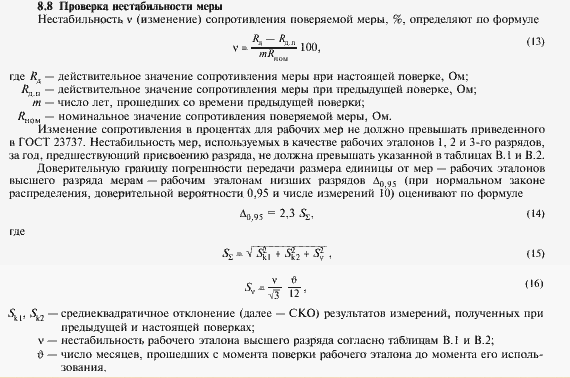 При калибровке нашей меры сопротивления ей присвоено значение 100,0056 Ом, установлено значение нестабильности 0,00014 Ом/год Наша мера была использована через 36 дней после ее калибровки для калибровки другой меры. Значит, поправка будет равна 0,00014*36/365=0,000014 Ом. В итоге нашей мере через 36 дней после калибровки присваиваем новое значение, а именно 100,005614 Ом. При этом к неопределенности, указанной в сертификате калибровки должны добавить неопределенность введенной поправки, что мы и делаем в соответствии с пунктом 6.2 и приложением В документа COOMET R GM 32:2017. Эта составляющая стандартной неопределенности равна (0,00014*36/365)/корень(12)=0,0000040 Ом