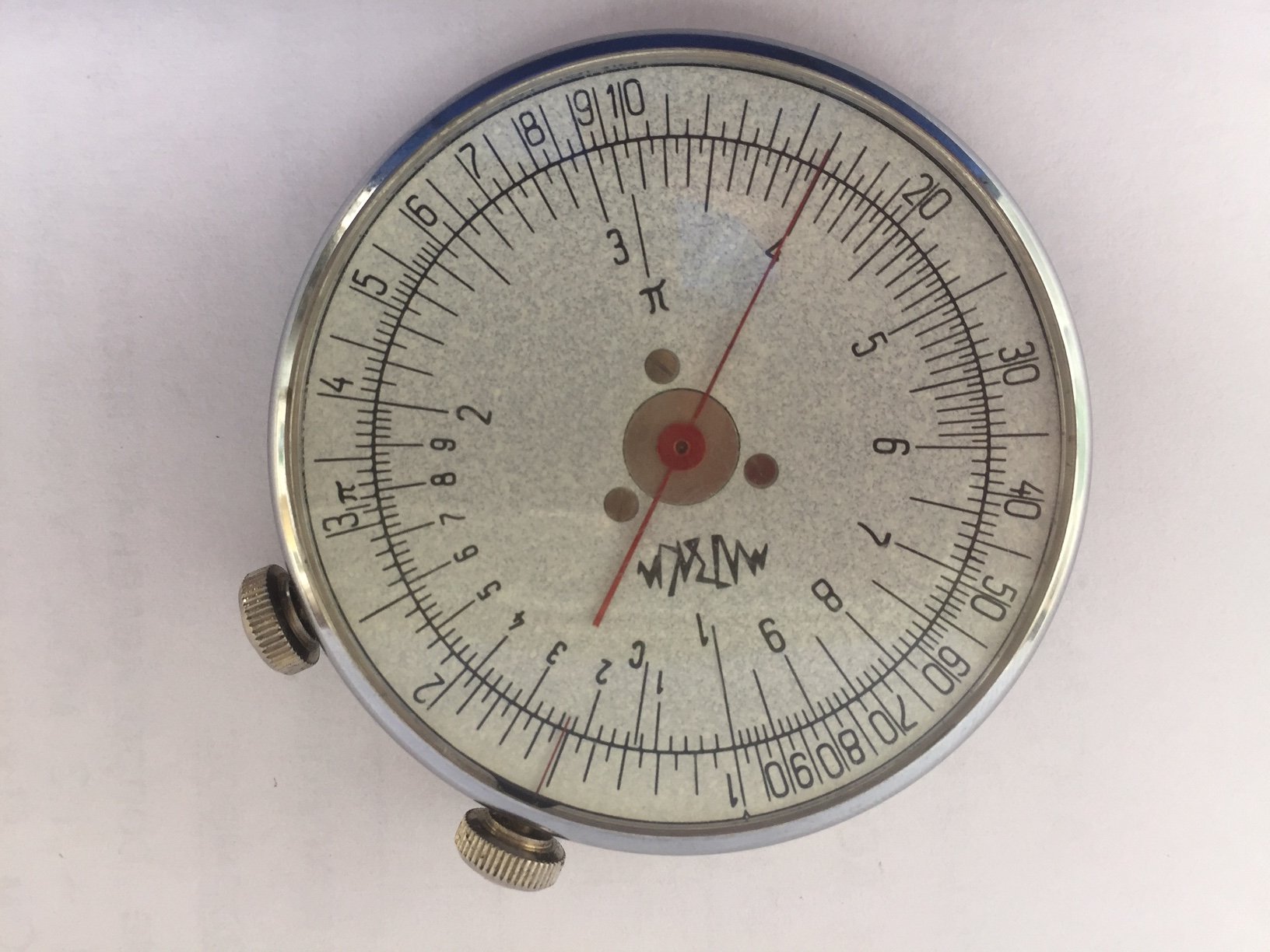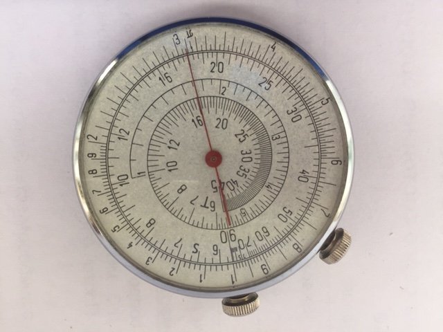 Здравствуйте, коллеги. Нашли такого "зверя"! Циферблаты с обеих сторон. На 1-м фото, где шкала по спирали, вращается стрелочка. А с оборотной стороны прибора (2-е фото) вращается сам циферблат. Может кто знает что измеряет и как используется?