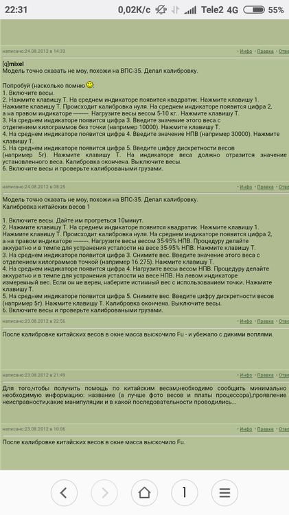 С праздником, господа! Ещё раз повторю свой ответ. Прежде чем меня поправлять следовало бы вам, уважаемые метрологии, эти весы в госреестре поискать. А если нет то и калибровки хватит. А применять в сфере торговля их все равно нельзя. ЦСМ в данном случае все равно бы помог)! Если там есть отдел юстировки весов. Кстати, юстировка данных весов делается элементарно. Нужна всего лишь эталонная гиря на 5 и 10 кг. Про это и в руководстве по эксплуатации написано и в гугле. Если человек не умеет читать даже меди... метрология бессильна. -