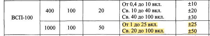 тоже соглашусь или для разных диапазонов, типа такого: причем в описании типа написано с ошибкой. Должно быть: от 1 до 20(25) кг - ± 25; св.20(25) до 100 вкл. - ± 50.... Тут 20 и 25 не стыкуются. Или я что-то не понимаю -