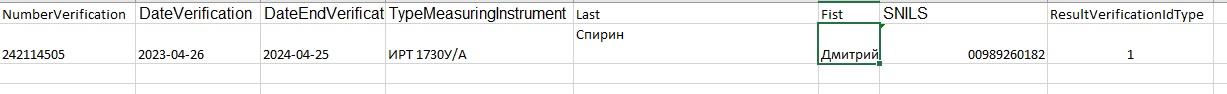С помощью измененного инструмента для создания хml файла для пакетной загрузки данных в Аршин, создали хml файл для пакетной загрузки в росаккредитацию. Образец хml файла прикрепляю к сообщению (название файла2). При загрузки файла на сайте росаккредитации файл загружается, но выдается ошибка что не правильно указаны данные в поле "Fist" и в поле "ResultVerification" (скринщот ошибки приведен в файле 2.). Данные в exel файле указаны в формате "Дмитрий Леонтьевич" в столбце "ResultVerification" и в формате "1"в столбце "ResultVerification"(смотри скриншот 3) Как правильно указывать данные? -