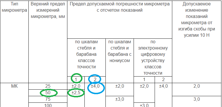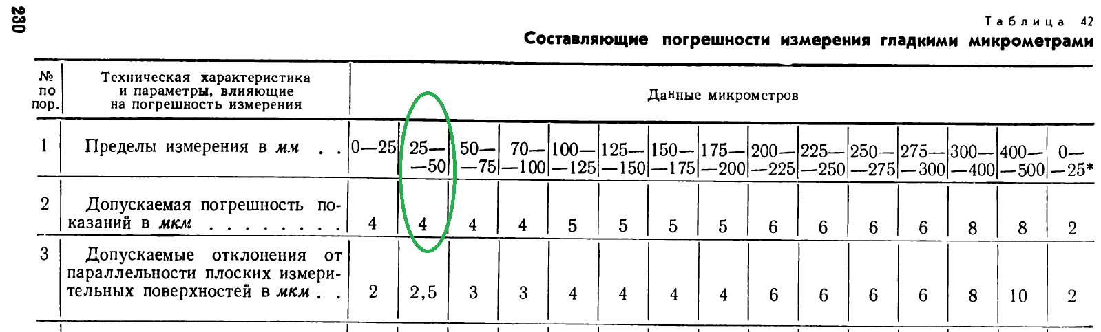 Нет, не 2 мкм. Я подчеркнула фразу, которая говорит о том, что для измерения одной детали - одно значение, а при измерении партии деталей берется удвоенное значение. В книге автор, Н.Н. Марков, привел пример со значением 2 мкм. Где я пишу что у меня погрешность 2 мкм? Таблица 47 распространяется на скобы. Характеристики микрометров гладких представлены в таблице 42. При этом нужно учесть, что данные в таблице представлены на 1960-й год, так как ГОСТ 6507-60, в настоящее время действует стандарт 1990-го года, ГОСТ 6507-90. Ну и пускай даже так, все-равно в таблице 42 книги Н.Н. Маркова представлена дп 4 мкм, что соответствует дп 4 мкм класса точности 2 микрометра по ГОСТ 6507-90. Чтобы не вносить погрешность измерений от нагрева рук, см. таблицу 43, нужно установить микрометр в стойку, измерения проводить в перчатках. Расчет я делала именно для 4 мкм.