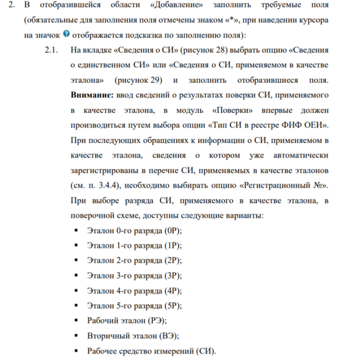 Выписать - внести сведения о результах поверки в Аршин. У простых СИ нет регистрационного номера СИ в реестре ФИФ ОЕИ. Вы считаете, что достаточно одной записи, так как она появляется как в разделе "СИ, применяемые в качестве эталона", так и в разделе "Результаты поверок СИ"? Я правильно поняла? Но эта запись только о СИ, как об эталоне 2-ого разряда по Кг, а по остальным величинам он не является эталоном и сведений о них нет. Как показать, что этим СИ можно пользоваться не только для измерения Кг? Раз нет сокращённой поверки, то это очевидно? В Руководстве пользователя по Аршину есть только такая информация. Либо простое СИ, либо СИ, как эталон.