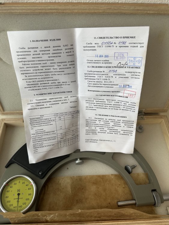 Продам скобы рычажные СРП 0-25,СРП 50 и т.д.Микрометры рычажные,нутромеры 18-50 ЦД 0,002мм,НИПТ 50-100 ЦД 0,002мм,Индикаторные головки МИГ 1,нутромер НМ 600,нутромер нм 1250,НМ 2500,микрометр мк 25,мк 50,МРИ 600,МРИ 800,МРИ 900,МРИ 1000,МК 600,МК 500,СИ 1000,СИ 900,КМД №1.,кольца образцовые для нутромеров 18-50 и 6-10.Всё новое с консервации.Цена 60-70 % от прайса торгующих фирм.Могу также организовать поверку в ЦСМ.- 6 ответов