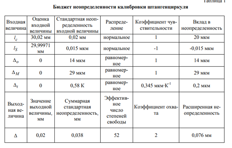 Друзья добрый день. Вот зачем мы выполняем поверу и калибровку СИ? Ответ очевиден, чтобы сделать заключение о пригодности того или иного СИ к применению. Когда мы выполняем поверку то там все просто, специалист, выполняющий поверку, в соответствии с методикой поверки делает заключение о пригодности. Теперь перейдем к калибровке. В соответствии с новыми веяниями, при выполнении калибровочных работ, специалист, по методике калибровки рассчитывает неопределенности, сводит расчеты в таблицу под названием бюджет неопределенности и отдает потребителю и потребитель глядя на эту таблицу должен сделать вывод о возможности применения СИ в работе. Давайте возьмем самое простое СИ - штангенциркуль. Вот у меня приведен бюджет неопределенности штангенциркуля ШЦ со значением отчета по нониусу 0,05 мм. Причем это бюджет неопределенности замера только одной точки 30 мм. Вот глядя на эту таблицу пользователь какой должен сделать вывод? Можно применять это СИ или нет, на какое значение из приведенных в таблице он должен посмотреть, что бы сделать однозначный вывод, что данное СИ пригодно к применению и его можно выдавать в работу?