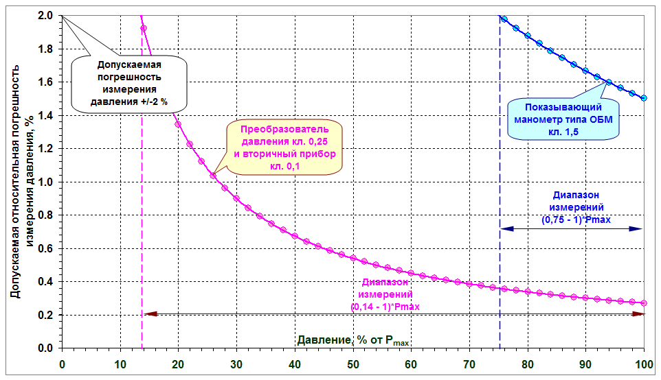 AGL 47 Опубликовано 23 Марта 2016 Жалоба Опубликовано 23 Марта 2016 Диапазон измерений манометра (ИК давления) зависит как от допускаемой относительной погрешности измерения давления, так и от точности применяемых СИ: чем выше допускаемая погрешность и чем точнее приборы, тем шире диапазон измерений. На рисунке показано, что при допускаемой отн. погрешности измерения давления, равной +/-2 %, обычный показывающий манометр кл. 1,5 будет иметь разрешенный диапазон измерений (0,75 - 1)*Pmax. А если применить преобразователь давления кл. 0,25 и вторичный прибор кл. 0,1, то у такого ИК рабочий диапазон измерений с доп. погрешностью не более +/-2 % уже составит (0,14 - 1)*Pmax. Цитата