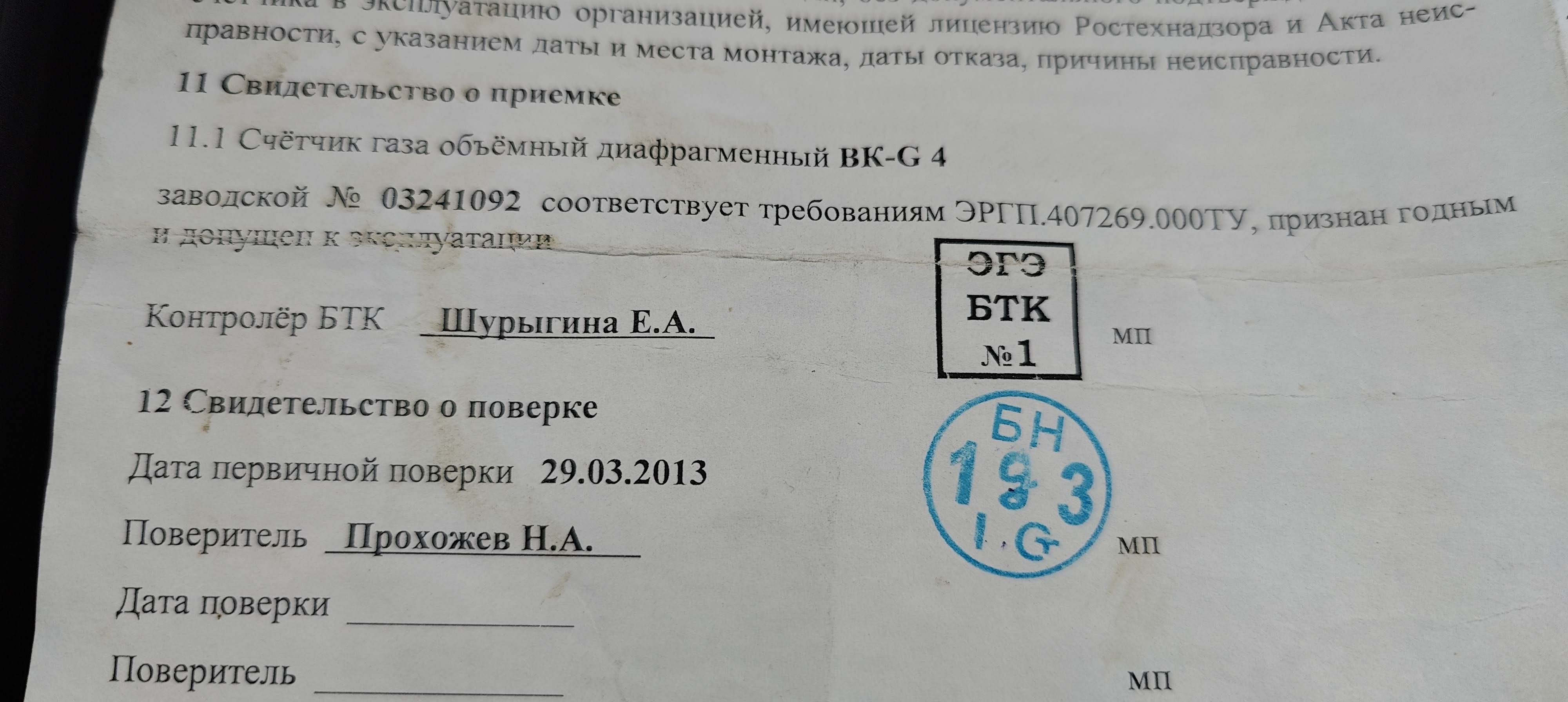 Счетчик газовый ВК-G4 производства 2013 года ООО "Эльстер Газэлектроника" г.Арзамас прослужил добрых 10 лет, после чего был поверен без снятия, внесен в Аршин и продолжил считать дальше до прихода контроллера Газпрома. С порога она потребовала предъявить оригинал паспорта и после тщательной проверки магнитом, зеркалом и осмотра заводской пломбы заявила, что оттиск в паспорте не совпадает полностью со свинц.пломбой завода (буква по центру отличается). Составила акт, о том что нарушена заводская пломба и необходимо срочно его заменить. На мои доводы о том, почему все десять лет не возникало вопросов, а в 2021 году даже была контрольная проверка счетчика (вместе с контролером присутствовал проверяющий из Москвы, составили кучу своих бумаг, делали фото и видео, возились целый час) - резонно ответила, что она при этих проверках не присутствовала и комментировать нечего. После посещения местного офиса Газпрома и выяснения обстоятельств, их руководством было принято решение о направлении запроса с фото пломбы и паспорта на завод. Ответ был получен только через два месяца, почитать не дали (только то запросу), но суть такова: счетчик с таким заводским номером другого года выпуска и марки, оттиск не наш, паспорт тоже не наш, скорее всего контрафакт. Счетчик приобретал в магазине у тогдашних газовиков, они мне его и устанавливали и вводили газовое оборудование в эксплуатацию. Уверен на 100%, что с момента установки никто его не вскрывал и не вносил каких либо изменений. Но в связи с таким ответом завода теперь не уверен, что этого не сделали ранее и мне по ошибке продали "чужой" счетчик.